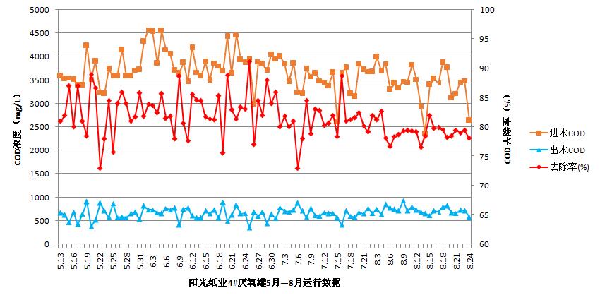 本項(xiàng)目采用我公司自主研發(fā)的LIC高效厭氧反應(yīng)器技術(shù),自今年5月初開始調(diào)試,經(jīng)過4個(gè)月的試運(yùn)行,厭氧系統(tǒng)一直穩(wěn)定運(yùn)行,并通過技術(shù)創(chuàng)新克服了造紙廢水鈣離子濃度高導(dǎo)致的顆粒污泥鈣化問題,使污泥活性保持在較高水平。厭氧反應(yīng)器CODCr容積負(fù)荷達(dá)到17.0kg/ m3?d以上,CODCr的去除率可穩(wěn)定達(dá)到80%以上,遠(yuǎn)超過目前國(guó)內(nèi)外造紙行業(yè)廢水厭氧處理CODCr70%的去除率。本項(xiàng)目運(yùn)行效果穩(wěn)定,保證了出水水質(zhì)達(dá)標(biāo)排放,獲得了業(yè)主的高度評(píng)價(jià)和贊譽(yù)!